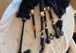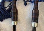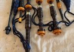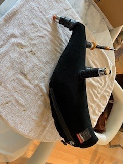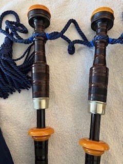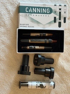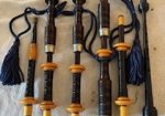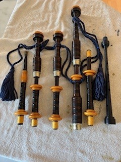 1950’s flat-combed stand of R. G, Lawrie blackwood bagpipes. The drones have imitation projection mounts, ring caps and bushings along with classic Lawrie closed ferrules. They are fitted into a Canmore hyde-synthetic, zippered bagpipe bag (L) and a brand-new Moose Valve has been installed. The stocks and the pipe chanter, Warnock, are maintenance free polypenco. Included is a set of Canning Drone Reeds, they lock in at 478Hz on the hemp lines, a set of Shepherd Tone Enhancers, and a bag cover with matching drone cords.
