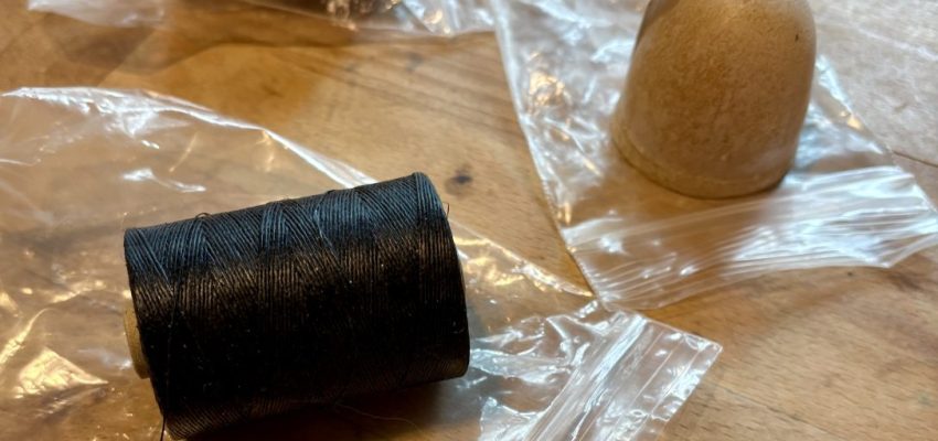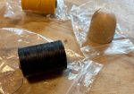 Brand new rolls of black waxed hemp, yellow waxed hemp, and a gob of unused beeswax.
