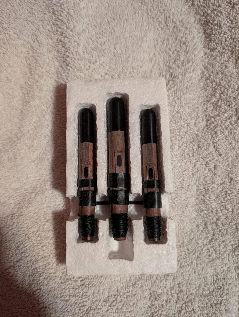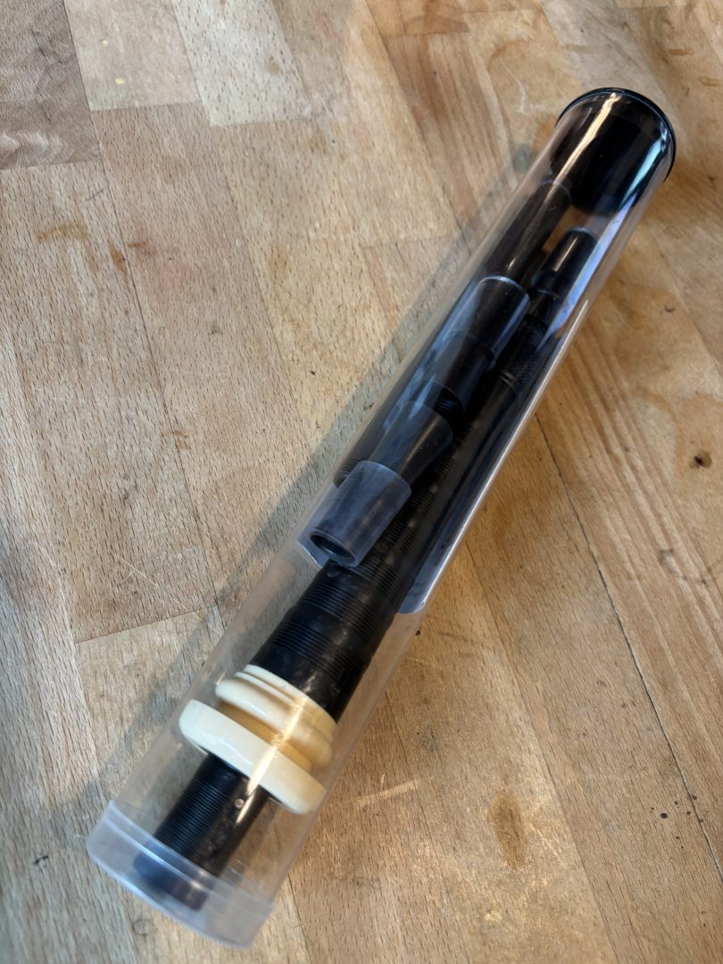 Set of uilleann pipes drones for left-handed players, manufactured by Carlos Aragón.